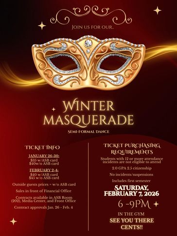 The Winter Masquerade dance takes place on Saturday, February 7th, 2026 from 6-9pm at the UCHS Gym & Activity Room (2/7/26). Ticket sales will be on campus at lunch from January 26-30, and February 2-4, 2026.